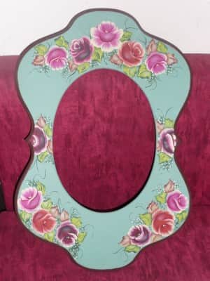 מסגרת המראה מצויירת בצבעי אקריליק ומעוטרת בפרחים
