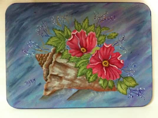 צור קשר להזמנה בנייד -052-8466292 | פריחה על צדף-ציור על עץ | ||