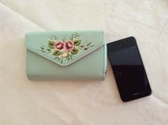 רתיק לכסף קטן ותא לאייפון צבע הנרתיק ירקרק מידות 15\10 ס"מ מתנה ליום הולדת \בת מצווה הנרתיק מעוטר בוורדים מעשה ידיי משדרג את הנרתיק |